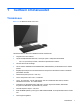 1 Tuotteen ominaisuudet Yleiskatsaus Kuva 1-1 HP EliteOne 800 G1 All-in-One HP EliteOne 800 G1 All-in-One sisältää seuraavat ominaisuudet: ● Integroitu All-in-One-rakenne ● Täyden teräväpiirtotarkkuuden IPS, LCD-näyttö (1920 x 1080) LED-taustavalolla ◦ 58, 4 cm (23-tuumaa) vinottain, valinnainen kapasitiivinen kosketus ● Telineen alustan alla niveltappi ● Teline voidaan määrittää korkeussäädettäväksi, kallistettavaksi, perustelineeksi tai se voidaan poistaa ● Käyttäjät ja asentajat voivat huolt