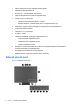 Taulukko 1-1 Edessä olevat osat Osa Osa 1 Verkkokamera (valinnainen) sulkupainikkeella 7 Kaiuttimien vaimennus 2 Kaksoismikrofoni (valinnainen) 8 Äänenvoimakkuuden vähentäminen 3 Verkkokameran merkkivalo (valinnainen verkkokamera) 9 Änenvoimakkuuden lisääminen 4 Laajakuvainen (16:9) LCD-näyttö LED-taustavalolla 10 Mikrofonin vaimennus 5 Virran LED-valo 11 Kirkkauden vähentäminen 6 Tehokkaat stereokaiuttimet 12 Kirkkauden lisääminen Kuvakkeen valo syttyy, kun kuvakealuetta (yllä 7–1