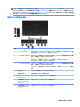名称 9 機能 オーディオ出力(ヘッ 別売または市販の別途電力が供給されているステレオ スピーカーまたはヘッ ドフォン)コネクタ ドフォンをモニターに接続します 警告!突然大きな音が出て耳を傷めることがないように、音量の調節を行って からヘッドフォン、イヤフォン、またはヘッドセットを使用してください。安 全に関する情報について詳しくは、『Product Notices』(製品についての注意事 項)を参照してください 注記:ヘッドフォン コネクタにデバイスを接続すると、コンピューター本体の スピーカーは無効になります 10 HDMI 入力端子 HDMI ケーブルを入力デバイスに接続します 11 HDMI 入力端子 HDMI ケーブルを入力デバイスに接続します 12 DisplayPort DisplayPort ケーブルを入力デバイスに接続します 注記:充電機能付き USB 3.