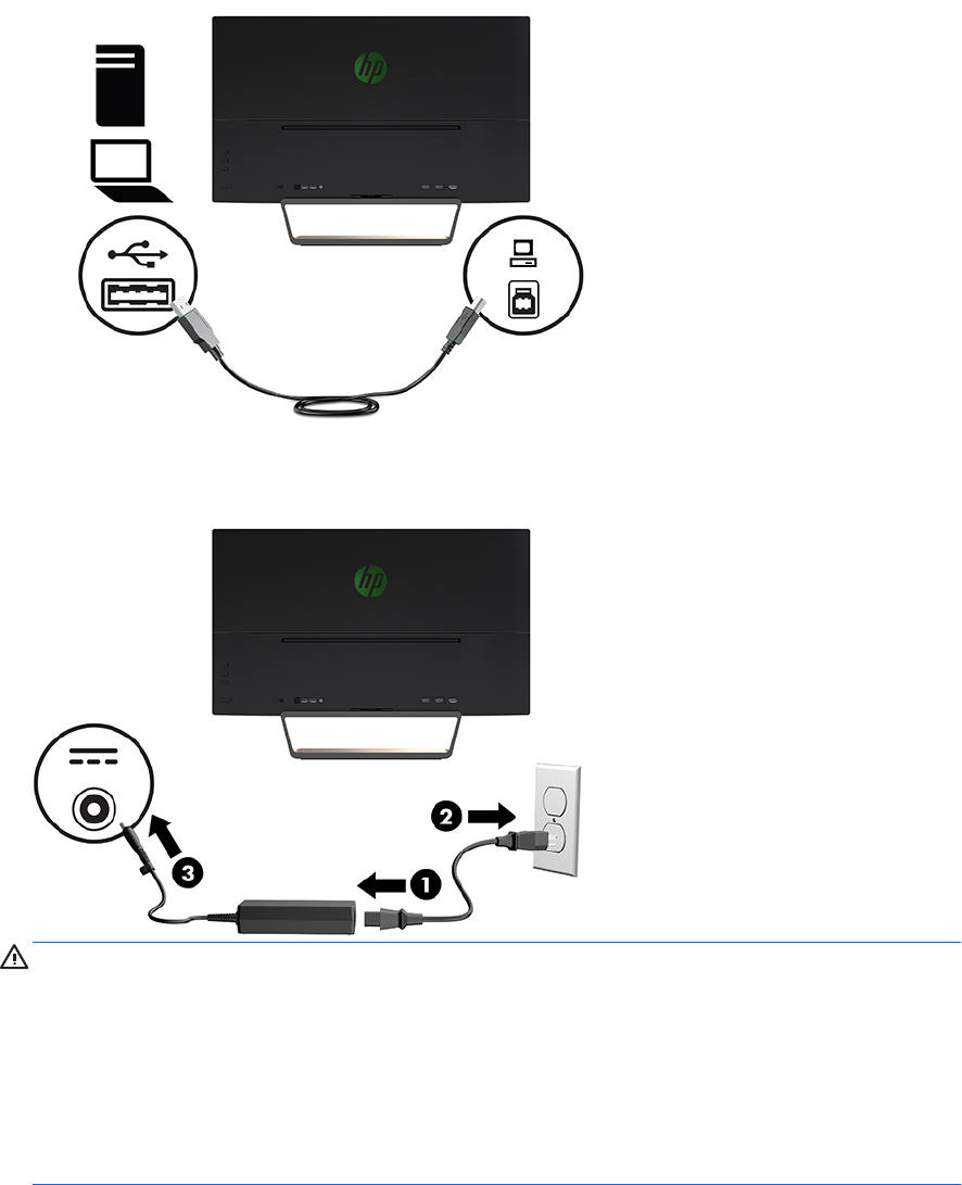 zásuvky (2) a potom připojte kulatý konec napájecí šňůry k monitoru (3).