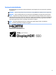 MERK: Skjermen oppdager automatisk hvilke innganger som har gyldige videosignaler. Inngangene kan velges ved å trykke på Pluss-knappen på siden av skjermen eller via skjermmenyen ved å trykke på Meny-knappen og velge Input Control (Inngangskontroll). ● Koble en ende av HDMI-kabelen til HDMI-porten bak på skjermen, og den andre enden til kildeenheten. ● Koble en DisplayPort-kabel til DisplayPort-kontakten bak på skjermen, og den andre enden til DisplayPort-porten på kildeenheten.
