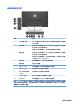 後面與側面的組件 元件 功能 1 「功能表」按鈕 按一下以開啟 OSD 功能表、從 OSD 中選取功能表項目,或關閉 OSD 功能表。 2 加號按鈕 如果 OSD 功能表已開啟,按一下按鈕可以向前瀏覽 OSD 功能表 各項功能,並進行遞增調整。 如果 OSD 功能表未啟用,按下按鈕可開啟音訊功能表。 3 減號按鈕 如果 OSD 功能表已開啟,按一下按鈕可以向後瀏覽 OSD 功能表 各項功能,並進行遞減調整。 如果 OSD 功能表未啟用,按下按鈕可前進至下一個作用中的輸 入連接埠(HDMI、DisplayPort)。 4 電源按鈕 螢幕電源關閉時,按此按鈕可開啟螢幕。 5 電源接頭 連接 AC 變壓器。 6 USB 2.0(上行) 將來源裝置的 USB 集線器纜線連接至螢幕。 7 USB 2.0(下行) 將選購的 USB 裝置連接至螢幕。 8 USB 2.