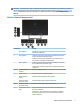 Komponentas Funkcija PASTABA: Jei prie ausinių jungties prijungiamas įrenginys, garsiakalbiai išjungiami. 10 HDMI prievadas HDMI kabelį prijungia prie šaltinio įrenginio. 11 HDMI prievadas HDMI kabelį prijungia prie šaltinio įrenginio. 12 DisplayPort prievadas „DisplayPort“ kabelį prijungia prie šaltinio įrenginio. PASTABA: Įkraunamasis USB 3.0 atsiuntimo srauto prievadas papildomai tiekia srovę, kuria įkraunamas įrenginys, pvz., išmanusis telefonas.