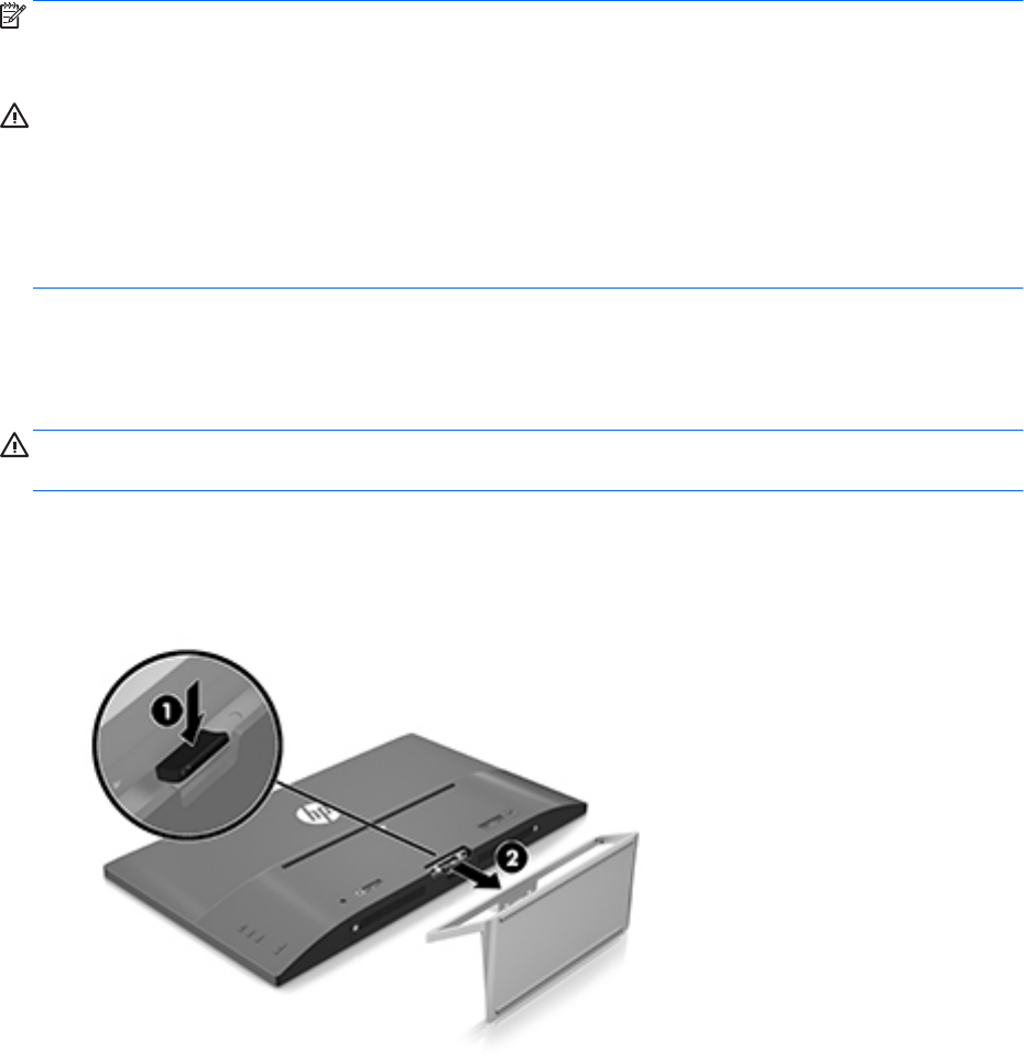 3. Нажмите на фиксатор (1) и потяните подставку разъема на панели дисплея (2).