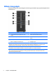 Előlapi részegységek A meghajtó-konfiguráció a típustól függően változhat. Egyes modelleken egy vagy több meghajtórekeszt takarólemez fed. 1 Merevlemez-meghajtó működését jelző LED 6 Kétállású bekapcsológomb 2 5,25 hüvelykes félmagas meghajtórekesz (a lap mögött) 7 Vékony optikai meghajtó (opcionális) 3 SD-kártyaolvasó (opcionális) 8 USB 2.0-töltőport (külön tápellátással rendelkezik, fekete) 4 USB 2.0 port (fekete) 9 USB 3.