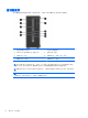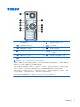 背面板组件 1 电源线连接器 7 PS/2 鼠标连接器(绿色) 2 PS/2 键盘连接器(紫) 8 串行连接器 3 DisplayPort 显示器接口 9 RJ-45 网络连接器 4 VGA 显示器连接器 10 具有从 S4/S5 唤醒功能的 USB 3.0 端 口(蓝色) 5 USB 3.0 端口(蓝色) 11 线路输入音频连接器(蓝色) 6 有源音频设备线路输出连接器(绿色) 注:HP 提供了另外一个可选串行端口和一个可选并行端口。 如果使用 USB 键盘,HP 建议将键盘连接到一个具有从 S4/S5 唤醒功能的 USB 3.
