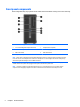 Rear panel components 1 Power Cord Connector 7 PS/2 Mouse Connector (green) 2 PS/2 Keyboard Connector (purple) 8 Serial Connector 3 DisplayPort Monitor Connectors 9 RJ-45 Network Connector 4 VGA Monitor Connector 10 USB 3.0 Ports with Wake from S4/S5 feature (blue) 5 USB 3.0 Ports (blue) 11 Line-In Audio Connector (blue) 6 Line-Out Connector for powered audio devices (green) NOTE: An optional second serial port and an optional parallel port are available from HP.