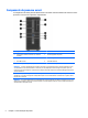 Composants du panneau avant La configuration des unités peut être différente selon le modèle. Certains modèles sont munis d’un cache protecteur recouvrant un ou plusieurs compartiments. 1 Voyant d'activité du disque dur 6 Bouton d'alimentation double état 2 Compartiment d'unité mi-hauteur 5,25" (derrière panneau) 7 Lecteur optique fin (en option) 3 Lecteur de cartes SD (en option) 8 Port de chargement USB 2.0 (avec alimentation) (noir) 4 Port USB 2.0 (noir) 9 Ports USB 3.
