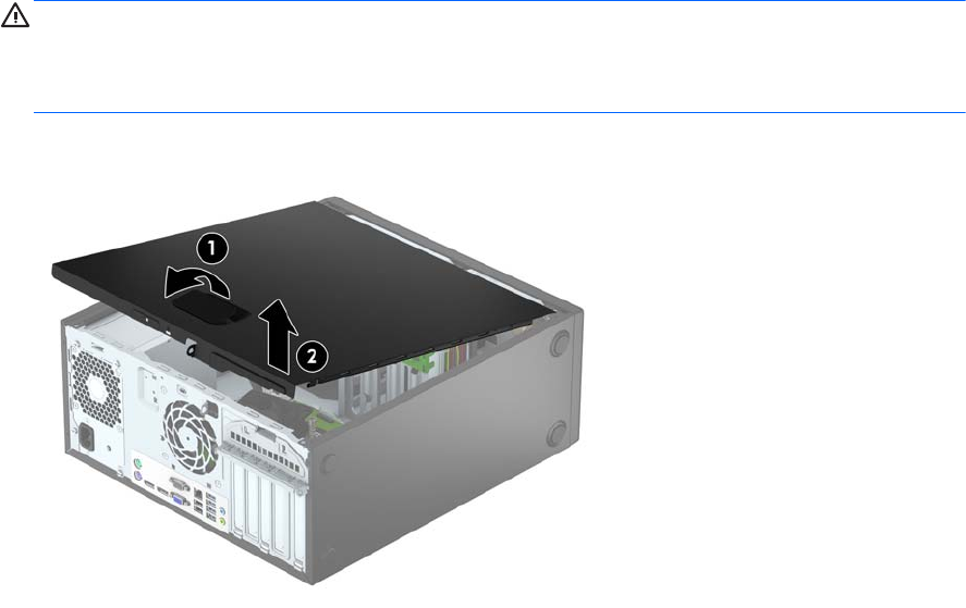 5. Поднимите рукоятку защитной панели (1), затем снимите защитную панель с компьютера (2).