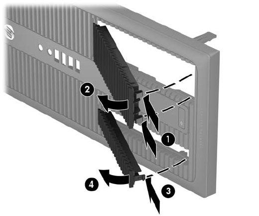 2. Для снятия 5,25-дюймовой декоративной заглушки оптического дисковода нажмите на две