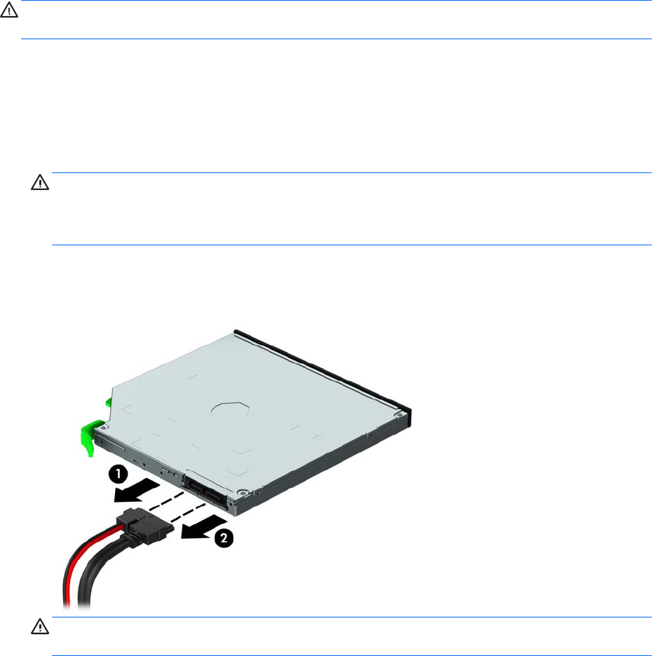 6. Отсоедините от задней панели дисковода кабель питания (1) и кабель данных (2).