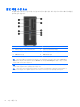 뒷면 패널 구성 요소 1 전원 코드 연결단자 7 PS/2 마우스 연결단자(녹색) 2 PS/2 키보드 연결단자(자주색) 8 직렬 연결단자 3 DisplayPort 모니터 커넥터 9 RJ-45 네트워크 연결단자 4 VGA 모니터 연결단자 10 S4/S5 에서 절전 모드 해제 기능이 있는 USB 3.0 포트(파란색) 5 USB 3.0 포트(파랑) 11 오디오 입력 라인 연결단자(파란색) 6 전원을 사용하는 오디오 장치용 출력 라인 연 결단자(녹색) 참고: 선택 사양인 보조 직렬 포트 및 선택 사양인 병렬 포트는 HP 에서 구입할 수 있습니다. USB 키보드를 사용할 경우 S4/S5 에서 절전 모드 해제 기능이 있는 USB 3.0 포트 중 하나에 키보드를 연결하는 것이 좋 습니다. S4/S5 에서 절전 모드 해제 기능은 F10 BIOS 설정에서 활성화된 경우 PS/2 커넥터에서도 지원됩니다.