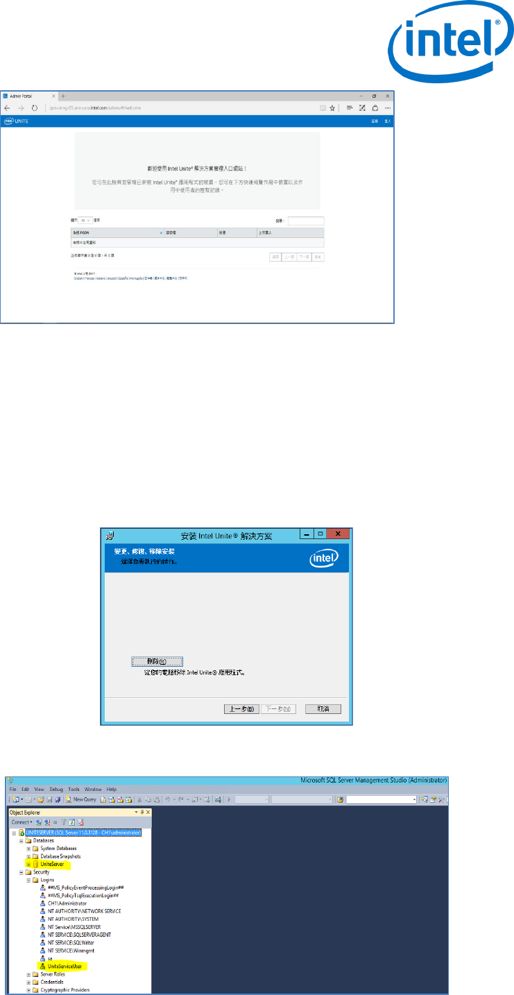 如果您需要解除安裝本應用程式,則亦須刪除之前建立的 UniteServer 資料庫和 UniteServiceUser 登入資料,
