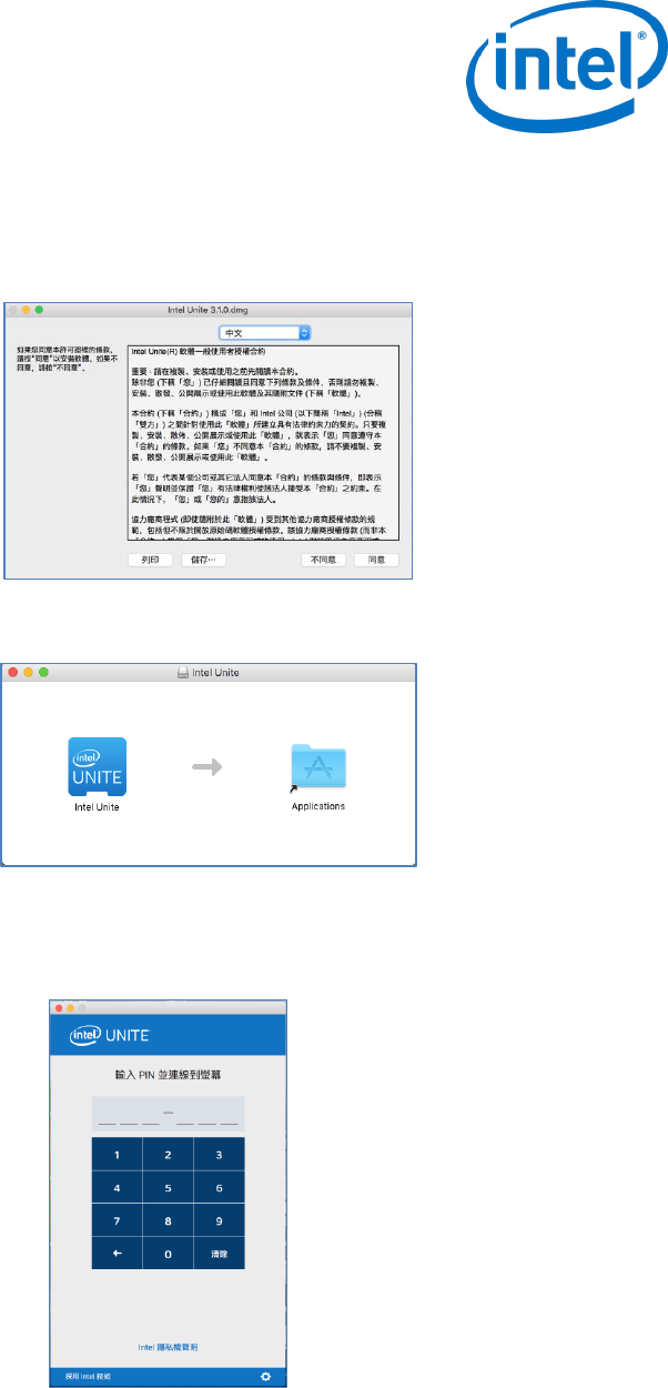 找到 Intel Unite macOS X,X.dmg 檔案,然後在您的 Mac 用戶端上下載軟體。連按兩下該檔案,將該