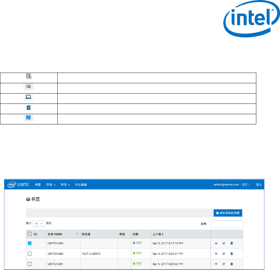 「裝置」頁面列出目前資料庫裡的所有裝置。您可以選取特定裝置,然後檢視、編輯、更新或移除。