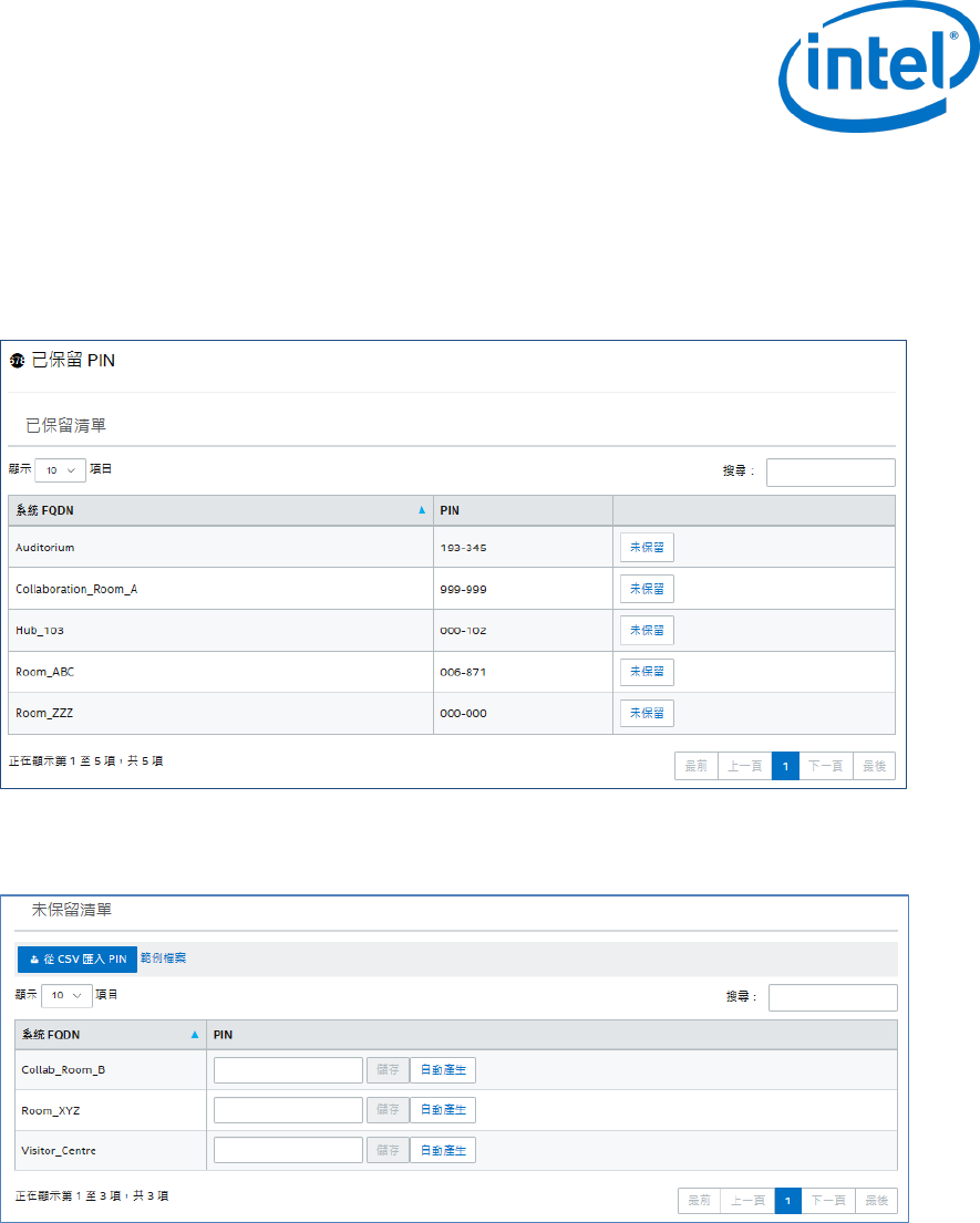 此頁面顯示兩個區段:已保留和未保留的系統清單是靜態或非靜態會議/工作階段期間顯示的 PIN。IT 管理員可
