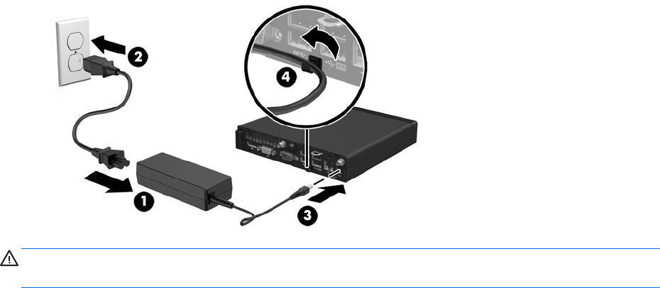 4. Dra eladapterns sladd genom klämfästet för att förhindra att eladapterns sladd lossnar från datorn (4).