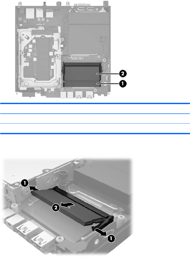 10. Ta bort en SODIMM genom att trycka spärrarna på vardera sidan av SODIMM (1) utåt och sedan dra ut