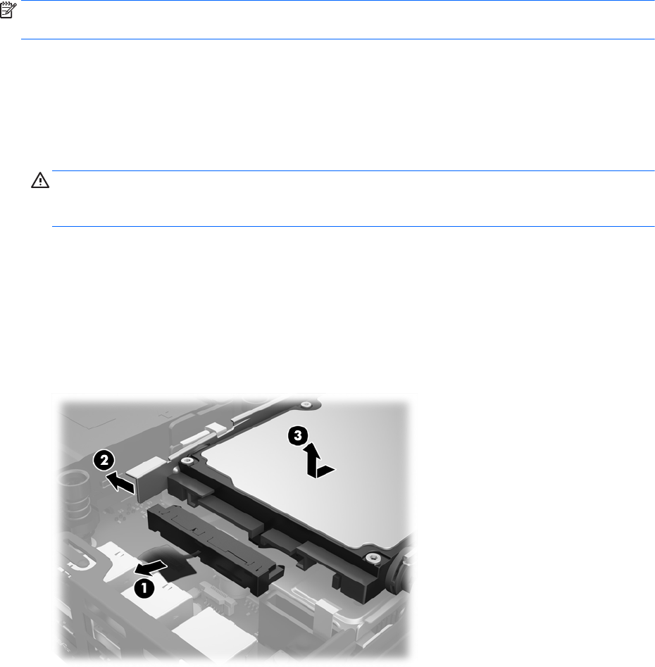 8. Dra frigöringsspaken som finns bredvid hårddiskens baksida bort från hårddisken (2). När du drar