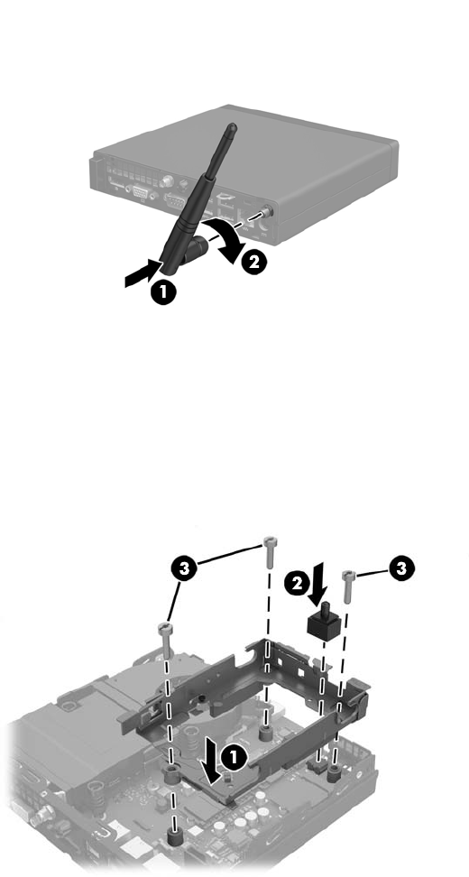 18. Mata fram kabeln till externa antennen genom hålen och skruva fast antennen i läge.