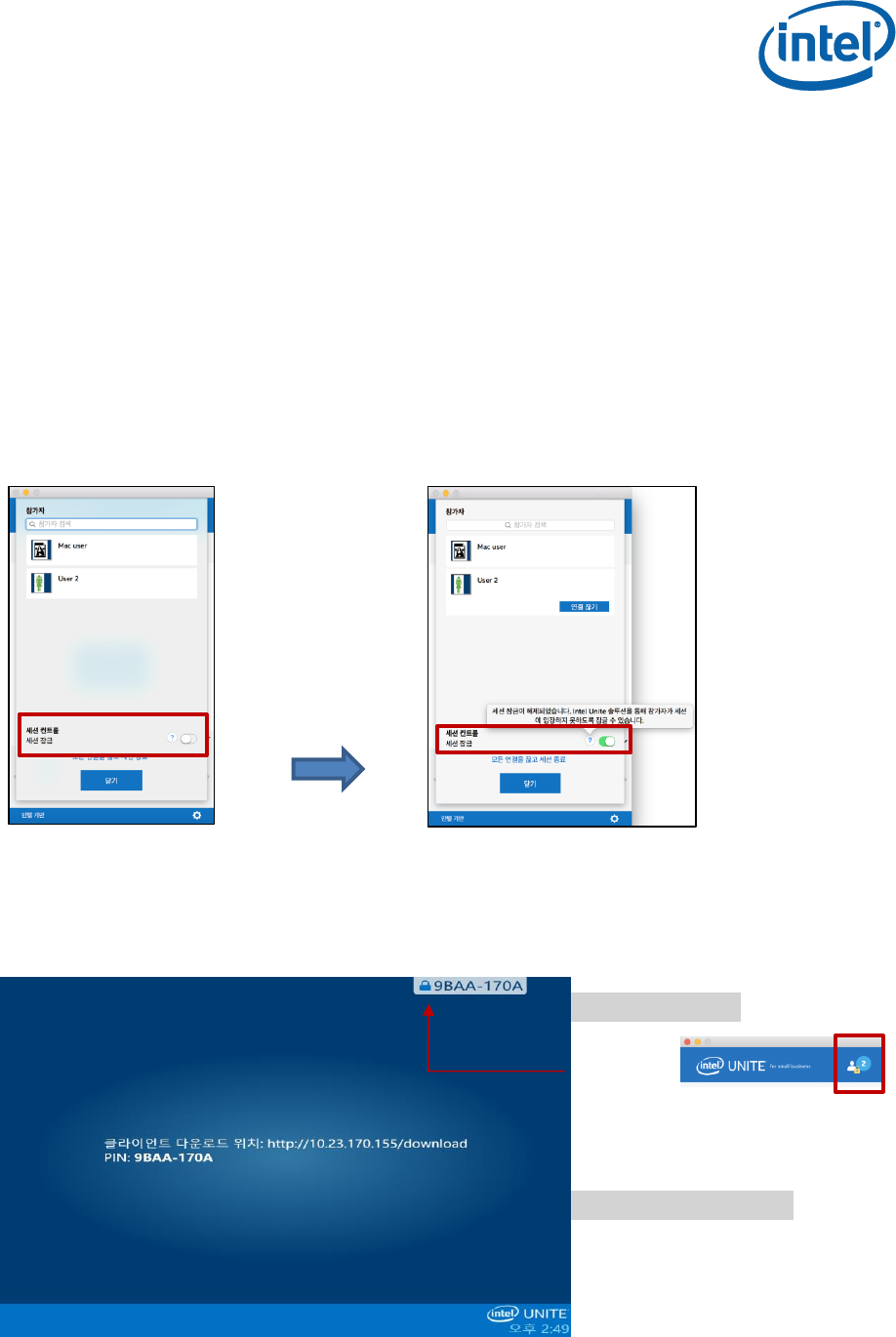 이 기능을 사용하면 사용자가 세션 잠금을 설정하여 다른 Intel Unite 응용 프로그램 사용자가 참석하여