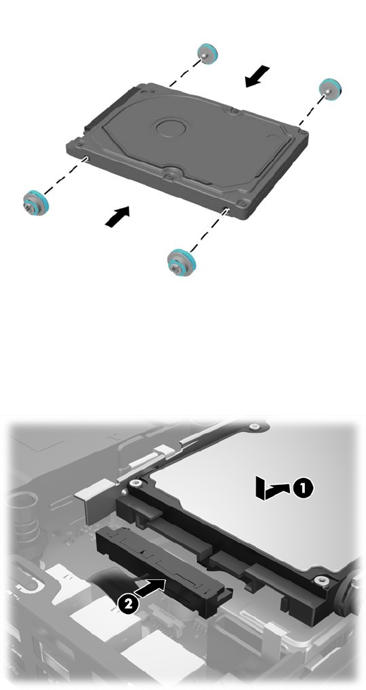 11. Свържете захранването и кабела за данни (2) към твърдия диск.