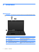Index A Aan/uit-knop herkennen 5 Aan/uit-lampje herkennen 4 Accu, herkennen 14 Acculampje herkennen 10 Accu-ontgrendelingen herkennen 12 Accuruimte 12, 15 Applicatietoets, Windows 6, 7 Audio-ingang (microfooningang), herkennen 9 Audio-uitgang (hoofdtelefoonuitgang), herkennen 8 B Besturingssysteem label met Certificaat van echtheid van Microsoft 15 productcode 15 Beveiligingskabel, bevestigingspunt herkennen 11 Bevestigingspunt beveiligingskabel 11 Bluetooth-label 16 C Caps lock-lampje, herkennen 4 Certifi