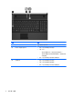 顶部组件 指点设备 组件 说明 (1) 触摸板 移动指针,选择或激活屏幕上的项。 (2) 触摸板左按钮 功能类似于外接鼠标的左键。 (3) 触摸板滚动区 向上或向下滚动。 (4) 触摸板右按钮 功能类似于外接鼠标的右键。 指示灯 注: 您的笔记本计算机的外观可能与本节中提供的插图略有不同。 顶部组件 3