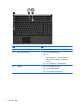 顶部组件 指点设备 组件 说明 (1) 触摸板* 移动指针,选择或激活屏幕上的项。 (2) 触摸板左按钮* 功能类似于外接鼠标的左键。 (3) 触摸板滚动区 向上或向下滚动。 (4) 触摸板右按钮* 功能类似于外接鼠标的右键。 *此表介绍出厂设置。要查看或更改指点设备首选项,请选择开始 > 控制面板 > 硬件和声音 > 鼠标。 指示灯 注: 您的笔记本计算机的外观可能与本节中提供的插图略有不同。 顶部组件 3