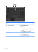 顶部组件 指点设备 组件 说明 (1) 触摸板* 移动指针,选择或激活屏幕上的项。 (2) 触摸板左按钮* 功能类似于外接鼠标的左键。 (3) 触摸板滚动区 向上或向下滚动。 (4) 触摸板右按钮* 功能类似于外接鼠标的右键。 *此表介绍出厂设置。要查看或更改指点设备首选项,请选择开始 > 控制面板 > 打印机和其它硬件 > 鼠标。 指示灯 注: 您的笔记本计算机的外观可能与本节中提供的插图略有不同。 顶部组件 3