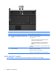 Komponente s gornje strane Pokazivački uređaji Komponenta Opis (1) TouchPad* Pomiče pokazivač i bira ili aktivira stavke na zaslonu. (2) Lijevi gumb TouchPada* Radi kao lijevi gumb na vanjskom mišu. (3) Zona za pomicanje TouchPada Pomiče prema gore ili dolje. (4) Desni gumb TouchPada* Radi kao desni gumb na vanjskom mišu. *Ova tablica opisuje tvorničke postavke. Da biste pogledali i promijenili svojstva pokazivačkog uređaja, odaberite Start > Upravljačka ploča > Pisači i ostali hardver > Miš.