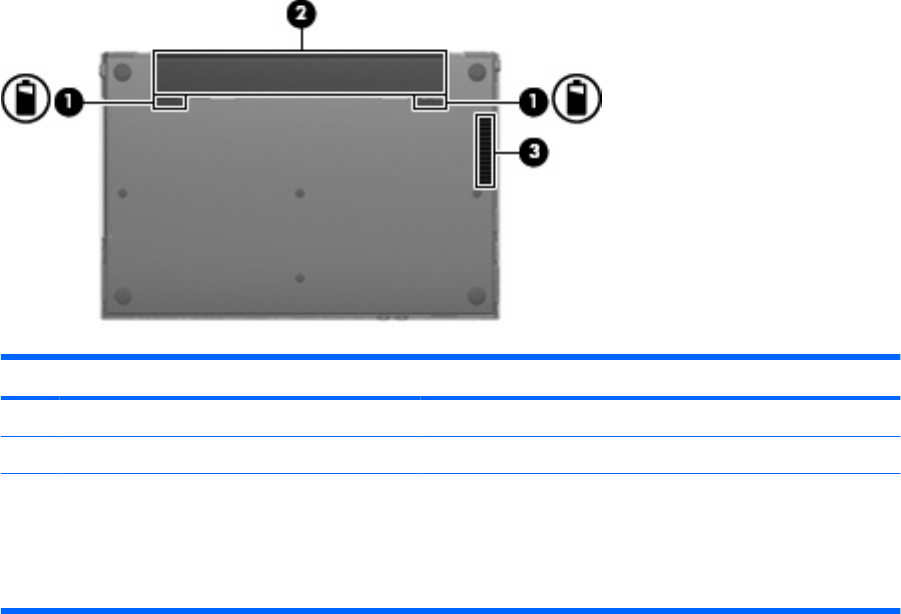 (1) Pestillos de liberación de la batería (2) Liberan la batería de su compartimento.