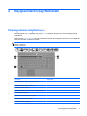 1 Osoitinlaitteiden käyttäminen Kohde Kuvaus (1) Kosketusalusta Siirtää osoitinta sekä valitsee ja aktivoi näytössä olevia kohteita. (2) Kosketusalustan vasen painike Toimii kuten ulkoisen hiiren ykköspainike. (3) Kosketusalustan vieritysalue Vierittää ylös- tai alaspäin. (4) Kosketusalustan oikea painike Toimii kuten ulkoisen hiiren kakkospainike.