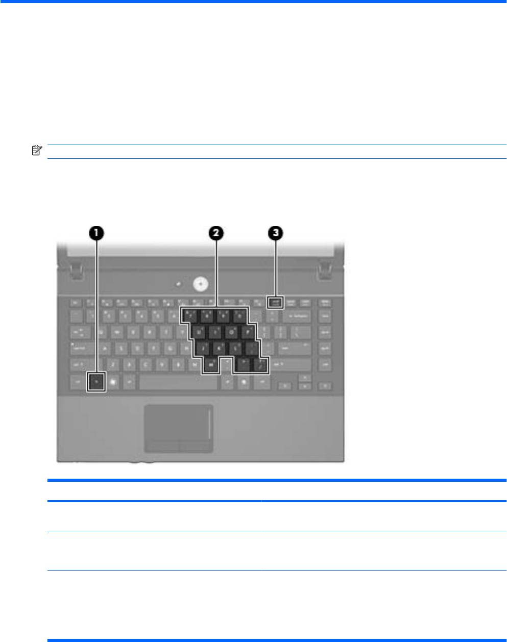 (3) num lock -näppäin Vaihtaa navigoinnin ja upotetun numeronäppäimistön numeeristen