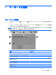 1 ポインティング デバイスの使用 名称 説明 (1) タッチパッド ポインターを移動して、画面上の項目を選択したり、アクティブ にしたりします (2) 左のタッチパッド ボタン 外付けマウスの左ボタンと同様に機能します (3) タッチパッドのスクロール ゾーン 画面を上下にスクロールします (4) 右のタッチパッド ボタン 外付けマウスの右ボタンと同様に機能します 1