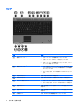 名称 説明 注記: 無線接続を確立するには、無線ネットワークをセット アップするか、セットアップ済みの場合は無線ネットワークにア クセスする必要があります (5) プレゼンテーション ボタン プレゼンテーション機能をオンにします (6) ミュート(消音)ボタン スピーカの音を消したり元に戻したりします (7) 音量調整スライダ スピーカの音量を調整します。指を左にスライドさせると音量が 下がり、右にスライドさせると音量が上がります。スクロール ゾーンの左側を押して音量を下げたり、右側を押して音量を上げ たりすることもできます (8) 計算機ボタン Windows の計算機機能をオンにします (9) 指紋認証システム パスワードの代わりに指紋認証を使用して Windows にログオン できます 表面の各部 7