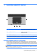1 Uporaba kazalnih naprav Komponenta Opis (1) Sledilna ploščica* Premakne kazalec in izbere ali aktivira elemente na zaslonu. (2) Levi gumb sledilne ploščice* Funkcije kot na levi tipki zunanje miške. (3) Bralnik prstnih odtisov Omogoča prijavo v operacijski sistem Windows s prstnim odtisom namesto prijave z geslom. (4) Desni gumb sledilne ploščice* Funkcije kot na desni tipki zunanje miške. (5) Drsno področje sledilne ploščice Drsi gor ali dol. * V tabeli so opisane privzete nastavitve.