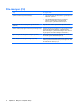 Diagnostics-menyen (Diagnose) 8 Velg For å gjøre dette System Diagnostics-menyen (Systemdiagnose) ● Kapittel 3 Menyer i Computer Setup F1 Systeminformasjon – viser følgende informasjon: ◦ ID-informasjon for datamaskinen og informasjon om batteriene i systemet. ◦ Spesifikasjonsinformasjon for prosessoren, bufferen, minnestørrelsen, systemets ROM, skjermutgave og tastaturkontrollerversjon. ● F2 Oppstartstest – kontrollerer systemkomponentene som er nødvendige for å starte datamaskinen.