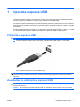 1 Uporaba naprave USB Universal Serial Bus (USB) je vmesnik strojne opreme, ki se lahko uporablja za priključitev dodatnih zunanjih naprav, kot so tipkovnica, miška, pogon, tiskalnik ali zvezdišče USB. Pri nekaterih napravah USB utegne biti potrebna dodatna podporna programska oprema, ki je običajno priložena napravi. Dodatne informacije o programski opremi, specifični za napravo, najdete v navodilih proizvajalca. Glede na model ima lahko računalnik do 4 vrata USB, ki podpirajo naprave USB 1.0, USB 1.