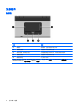 顶部组件 触摸板 组件 说明 (1) 触摸板* 移动指针,选择或激活屏幕上的项。 (2) 触摸板左按钮* 功能类似于外接鼠标的左键。 (3) 指纹识别器(仅限某些机型) 允许使用指纹登录 Windows,而无需使用密码登录。 (4) 触摸板右按钮* 功能类似于外接鼠标的右键。 (5) 触摸板滚动区 向上或向下滚动。 *此表介绍的是出厂时的设置。要查看或更改指点设备首选项,请选择 Start(开始) > Control Panel(控制面板) > Hardware and Sound(硬件和声音) > Mouse(鼠标)。 4 第 2 章 组件