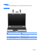 前部组件 组件 (1) (2) (3) (4) 说明 无线设备指示灯 电源指示灯 电池指示灯 驱动器指示灯 ● 蓝色:打开了集成的无线设备,如无线局域网 (WLAN) 设备、 HP Broadband Wireless 模块和/或 Bluetooth 设备。 ● 琥珀色:关闭了所有无线设备。 ● 亮起:笔记本计算机处于开启状态。 ● 闪烁:笔记本计算机处于睡眠状态。 ● 快速闪烁:应连接功率更高的交流电源适配器。 ● 熄灭:笔记本计算机处于关闭状态或休眠模式。 ● 琥珀色:电池正在充电。 ● 青绿色:电池即将充足电。 ● 琥珀色,闪烁:作为唯一可用电源的电池电量不足。如果电池 电量严重不足,电池指示灯便开始快速闪烁。 ● 熄灭:如果笔记本计算机连接外部电源,当笔记本计算机中的 所有电池都充足电后指示灯便会熄灭。如果笔记本计算机未与 外部电源相连,在电池电量不足之前该指示灯一直不亮。 ● 闪烁:正在访问硬盘驱动器或光驱。 ● 琥珀色(仅限某些机型):HP 3D DriveGuard 已经暂时停止 了硬盘驱动器。 (5) 显示屏释放锁定器 翻开