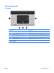 Top components TouchPad Component Description (1) TouchPad* Moves the pointer and selects or activates items on the screen. (2) Left TouchPad button* Functions like the left button on an external mouse. (3) Fingerprint reader (select models only) Allows a fingerprint logon to Windows, instead of a password logon. (4) Right TouchPad button* Functions like the right button on an external mouse. (5) TouchPad scroll zone Scrolls up or down. *This table describes factory settings.