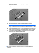 Tilføjelse eller udskiftning af et hukommelsesmodul i slotten til hukommelsesmodul Slotten til hukommelsesudvidelsesmodulet findes ovenover slotten til det primære hukommelsesmodul Benyt følgende fremgangsmåde for at tilføje eller udskifte et hukommelsesmodul i slotten til hukommelsesudvidelsesmodul: 1. Gem dataene. 2. Luk computeren ned, og luk skærmen. Hvis du er i tvivl om, hvorvidt computeren er slukket eller i dvaletilstand, kan du tænde for den ved at trykke på tænd/sluk-knappen.