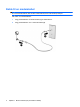 Koble til en modemkabel ADVARSEL: Hvis du plugger en modemkabel (følger bare med enkelte modeller) eller telefonkabel i RJ-45-nettverkskontakten, kan det føre til elektrisk støt, brann eller skade på utstyret. Slik kobler du til modemkabelen: 2 1. Plugg modemkabelen i modemkontakten (1) på datamaskinen. 2. Plugg modemkabelen i RJ-11-telefonkontakten (2).