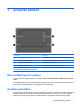 1 Använda pekdon Komponent Beskrivning (1) Styrplatta* Flyttar pekaren och väljer eller aktiverar objekt på skärmen. (2) Vänster knapp på styrplattan* Fungerar som vänsterknappen på en extern mus. (3) Styrplattans rullningsområde För rullning uppåt och nedåt. (4) Höger knapp på styrplattan* Fungerar som högerknappen på en extern mus. *I den här tabellen beskrivs fabriksinställningarna.