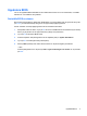 Uppdatera BIOS Om du vill uppdatera BIOS fastställer du först vilken BIOS-version du har för närvarande, och laddar därefter ner och installerar det nya BIOS. Fastställa BIOS-versionen BIOS-versionsinformationen (kallas även ROM-datum och system-BIOS) visar du genom att du trycker på fn+esc (om Windows® körs) eller genom att öppna Setup-hjälpprogrammet. Så här använder du Setup-hjälpprogrammet för att visa BIOS-information: 1. Sätt på eller starta om datorn.