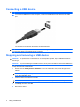 Connecting a USB device CAUTION: To prevent damage to a USB connector, use minimal force to connect a USB device. ▲ To connect a USB device to the computer, connect the USB cable for the device to the USB port. You will hear a sound when the device has been detected. NOTE: The first time you connect a USB device, a message is displayed in the notification area to let you know the device is recognized by the computer.