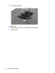 在扩展内存模块插槽中添加或更换内存模块 扩展内存模块插槽位于主内存模块插槽上方。要在扩展内存模块插槽中添加或更换内存模块,请执行以 下步骤: 1. 保存所做的工作。 2. 关闭笔记本计算机并合上显示屏。 如果您无法确定笔记本计算机是已经关闭还是处于休眠模式,请先按电源按钮打开计算机, 然后 通过操作系统关闭笔记本计算机。 3. 断开所有与计算机相连的外接设备。 4. 将电源线插头从交流电源插座上拔下。 5. 翻转笔记本计算机,将其放在平整的表面上。 6. 从笔记本计算机中取出电池。 7. 拧开内存模块盒盖的螺钉 (1)。 8. 提起内存模块盒盖 (2),使其脱离计算机。 9. 要从扩展内存插槽中取出内存模块,请执行以下步骤: a.