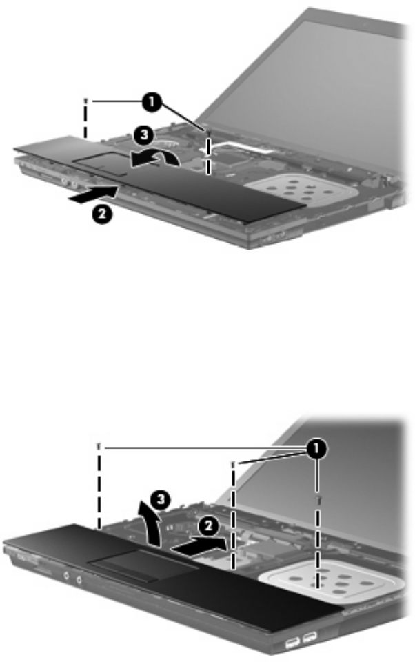 b. Slide the palm rest back toward the display (2), and then lift and rotate the front edge (3) to