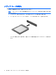 メディア カードの挿入 注意: メディア カードまたはコンピューターの損傷を防ぐため、メディア カード スロットには、 どのような種類のアダプターも挿入しないでください。 注意: メディア カード コネクタの損傷を防ぐため、メディア カードの挿入時に必要以上の力を加 えないでください。 1. メディア カードのラベルを上にし、コネクタをコンピューター側に向けて持ちます。 2.